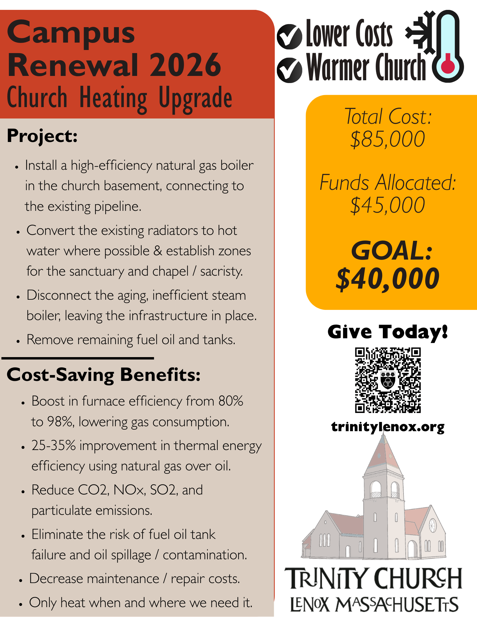 The boiler in the church has done good work and good service to us, but it is coming the end of its life, and we need to plan for the future. This spring we will be replacing the current steam boiler with a new hot-water system. Converting to hot water means that we will be able to create a separate zone for the chapel. We will also be able to convert to natural gas. All of these changes will help us reduce our carbon use and also our costs.